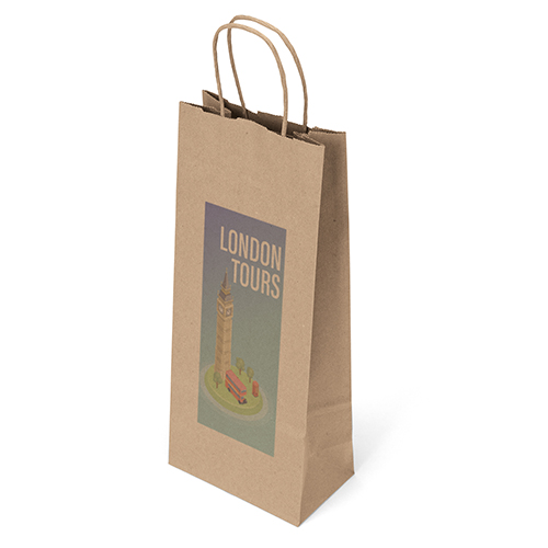 The Eco Vino is made from brown kraft paper and has twisted paper handles and a serrated top. The eco-friendly bag is made from 100% recycled paper with a minimum of 60% recycled post-consumer content.