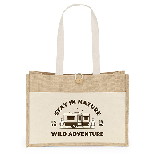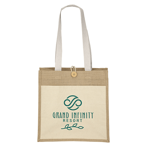The Riley Jute Tote (17W x 6 x 12H) features a natural-colored jute exterior paired with a 10 oz. cotton front pocket offering a generous imprint area, 28"-long cotton twill handles, and a wooden button with loop closure. The interior is laminated for added durability. Due to the natural character of cotton fabric, slight color variances will occur between bags.