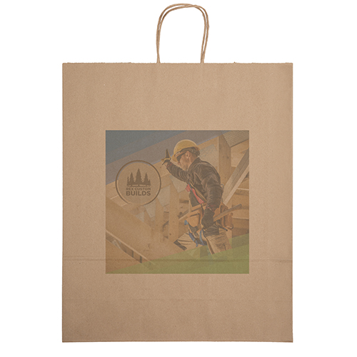 The Eco Brute is made from brown kraft paper and has twisted paper handles and a serrated top. The eco-friendly bag is made from 100% recycled paper with a minimum of 60% recycled post-consumer content.