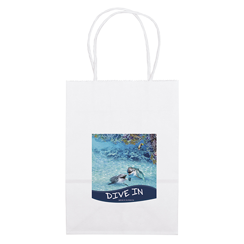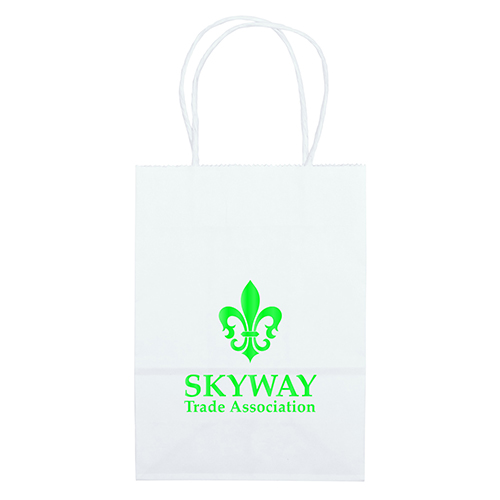 The Mini White Shopper is made with white kraft paper and features twisted paper handles and a serrated cut top.