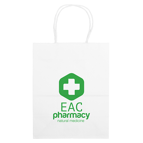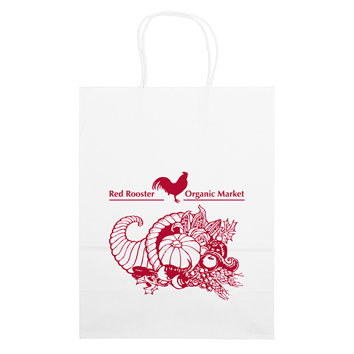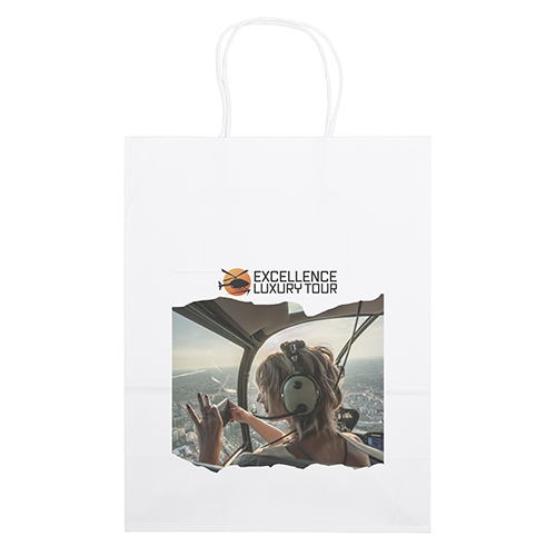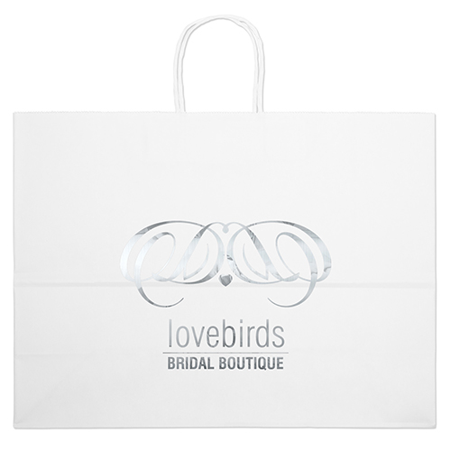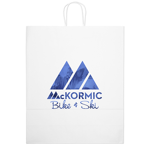 The Vogue White Shopper is made with white kraft paper and features twisted paper handles and a serrated cut top.