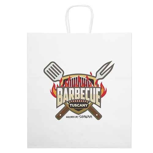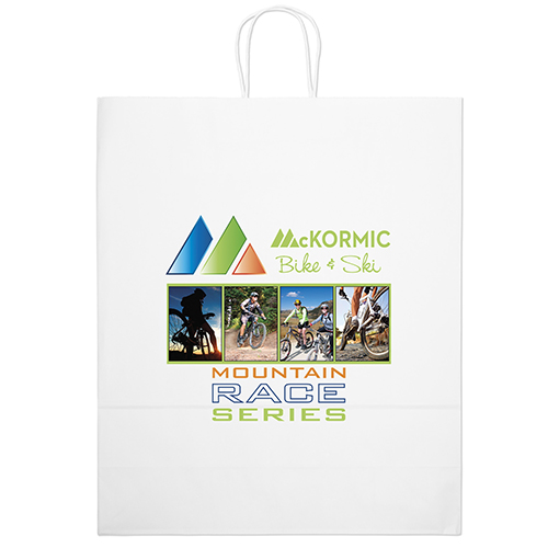 The Brute White Shopper is made with white kraft paper and features twisted paper handles and a serrated cut top.