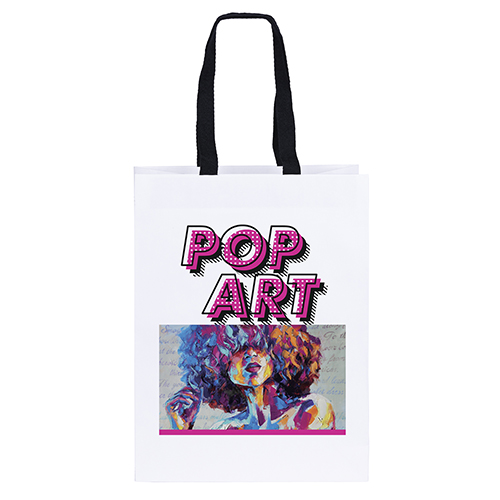 The McKinley is a matte-laminated Eurotote with a unique trapezoid shape, woven handles, reinfoced fold-over top, and cardboard bottom insert.