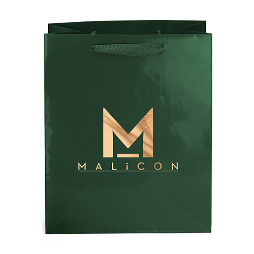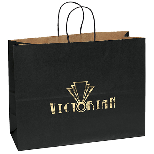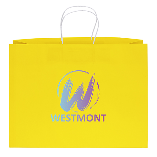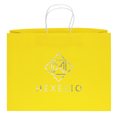 The Amber Gloss Shopper features a glossy paper finish and twisted kraft paper handles.