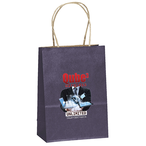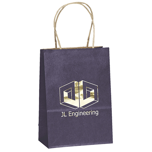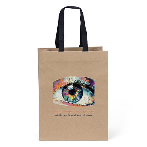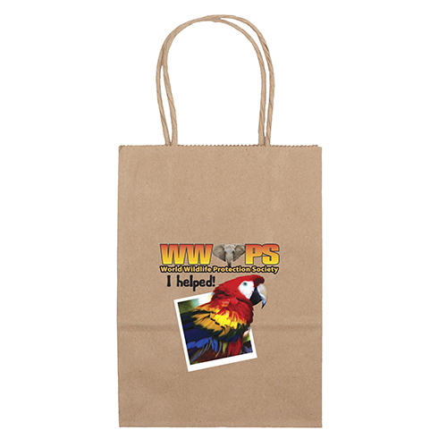 The Eco Mini is made from brown kraft paper and has twisted paper handles and a serrated top. The eco-friendly bag is made from 100% recycled paper with a minimum of 60% recycled post-consumer content.