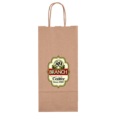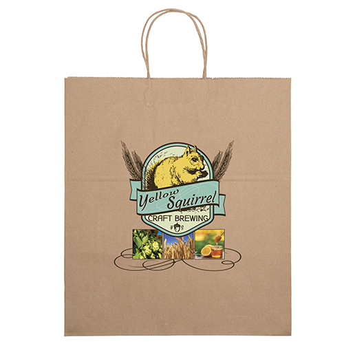 The Eco Pup is made from brown kraft paper and has twisted paper handles and a serrated top. The eco-friendly bag is made from 100% recycled paper with a minimum of 60% recycled post-consumer content.