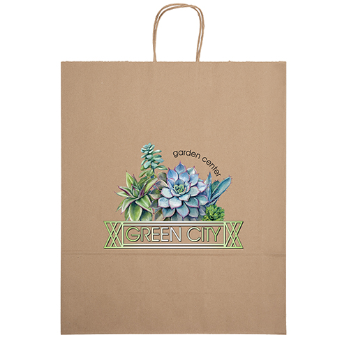 The Eco Citation is made from brown kraft paper and has twisted paper handles and a serrated top. The eco-friendly bag is made from 100% recycled paper with a minimum of 60% recycled post-consumer content.