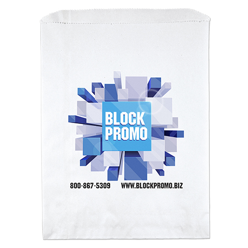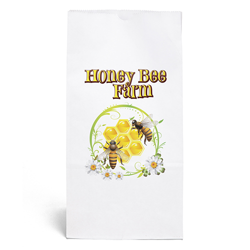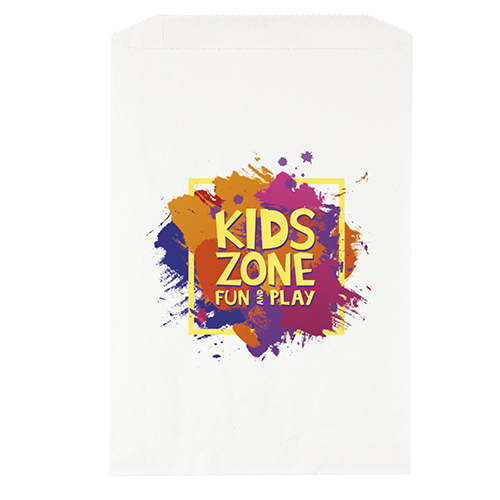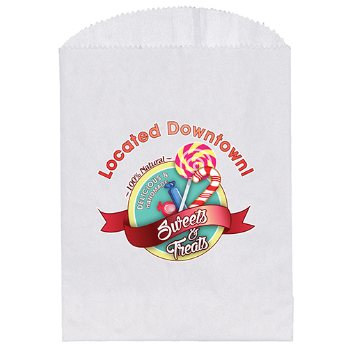 White paper bag features a serrated cut top, pinch bottom, and a side and bottom gusset.
