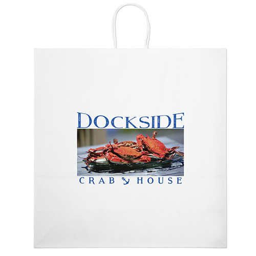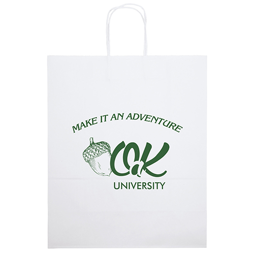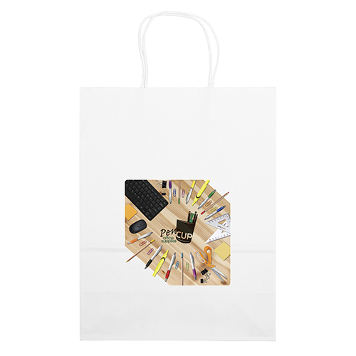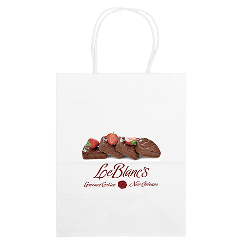 The Stephanie White Shopper is made with white kraft paper and features twisted paper handles and a serrated cut top.