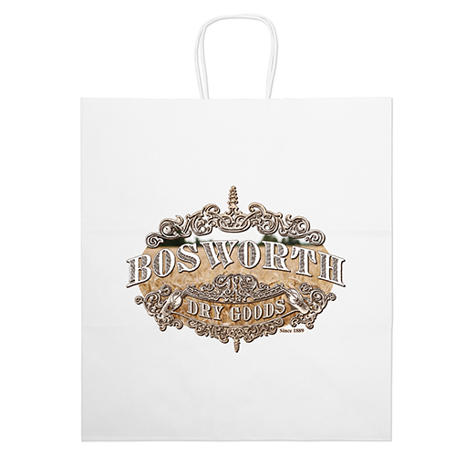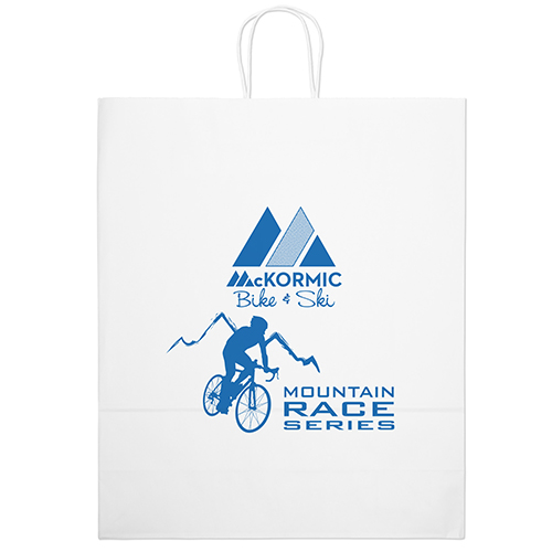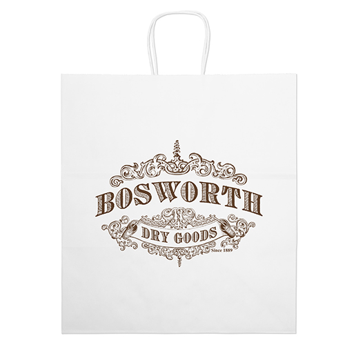 The Duke White Shopper is made with white kraft paper and features twisted paper handles and a serrated cut top.