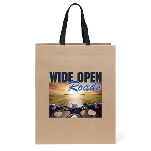 The Eco Vogue is made from brown kraft paper and has twisted paper handles and a serrated top. The eco-friendly bag is made from 100% recycled paper with a minimum of 60% recycled post-consumer content.