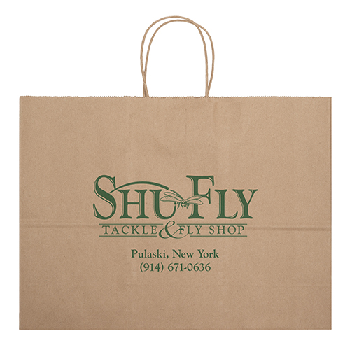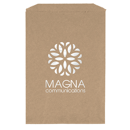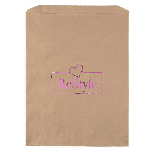 Unlined white or recycled brown kraft paper Merchandise Bag features a serrated top, pinch bottom, and no gusset. Brown kraft paper is made from 100% recycled paper with a minimum of 95% post-consumer content.