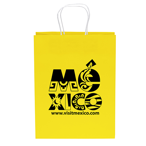 The Brite Vogue Shopper is a brightly colored 75# matte paper bag with a fold-over top and white twisted paper handles. Available in a variety of colors: Brite Blue, Teal, Yellow, Lime, and Pink.