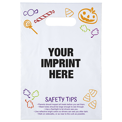 The 9W x 13H Digital Full Color Die Cut Bag is made with 2.0 mil plastic and has non-reinforced die cut handles. The Digital Full Color print process showcases Halloween artwork on one side with safety tips on the secon side. This process offers crisp colors, a generous imprint area, and exceptional clarity for small fonts, fine lines, and details