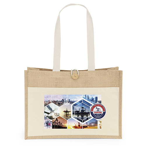 The Riley Jute Tote (17W x 6 x 12H) features a natural-colored jute exterior paired with a 10 oz. cotton front pocket offering a generous imprint area, 28"-long cotton twill handles, and a wooden button with loop closure. The interior is laminated for added durability. Due to the natural character of cotton fabric, slight color variances will occur between bags.