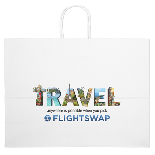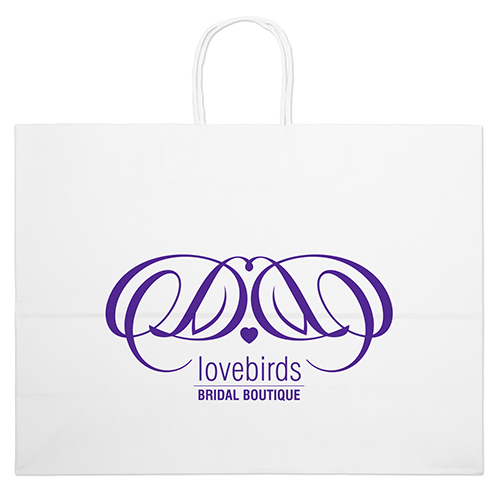 The Vogue White Shopper is made with white kraft paper and features twisted paper handles and a serrated cut top.