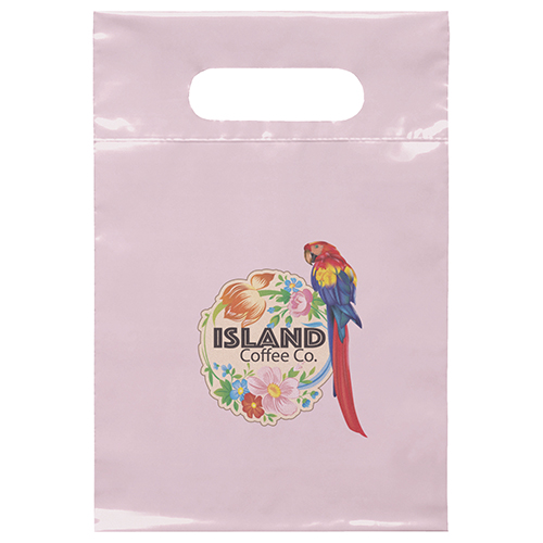 The 7 1/2W x 9H Digital Full Color Die Cut Bag is made with 2.0 mil plastic and has non-reinforced die cut handles. The Digital Full Color print process showcases artwork with crisp colors, a generous imprint area, and exceptional clarity for small fonts, fine lines, and details.