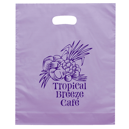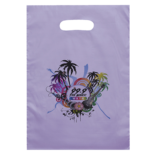 The 15W x 18H Digital Full Color Die Cut Bag is made with 2.0 mil plastic and non-reinforced die cut handles. The Digital Full Color print process showcases artwork with crisp colors, a generous imprint area, and exceptional clarity for small fonts, fine lines, and details.