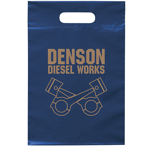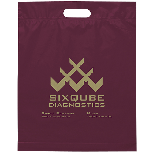 The 16W x 13H Digital Full Color Die Cut Bag is made with 2.0 mil plastic and non-reinforced die cut handles. The Digital Full Color print process showcases artwork with crisp colors, a generous imprint area, and exceptional clarity for small fonts, fine lines, and details.