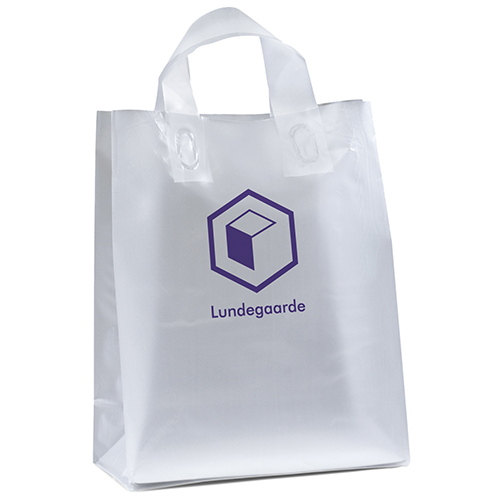 Frosted hi-density plastic bag is made with fused loop handles and a cardboard bottom insert.