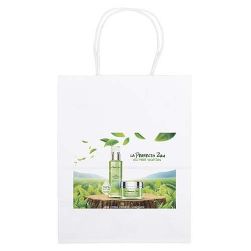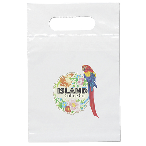 The 7 1/2W x 9H Digital Full Color Die Cut Bag is made with 2.0 mil plastic and has non-reinforced die cut handles. The Digital Full Color print process showcases artwork with crisp colors, a generous imprint area, and exceptional clarity for small fonts, fine lines, and details.