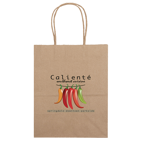 The Eco Mini is made from brown kraft paper and has twisted paper handles and a serrated top. The eco-friendly bag is made from 100% recycled paper with a minimum of 60% recycled post-consumer content.