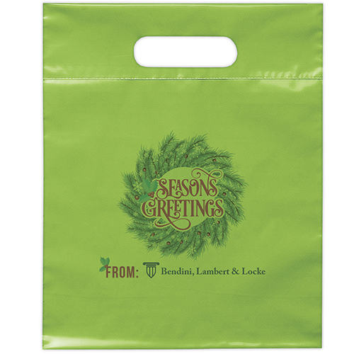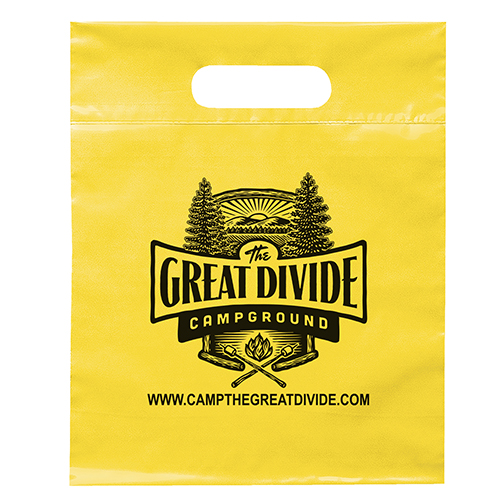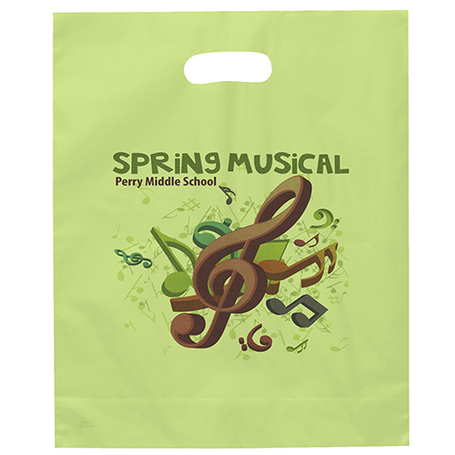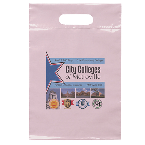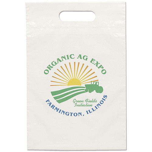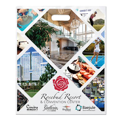 The 16W x 13H Digital Full Color Die Cut Bag is made with 2.0 mil plastic and non-reinforced die cut handles. The Digital Full Color print process showcases artwork with crisp colors, a generous imprint area, and exceptional clarity for small fonts, fine lines, and details.