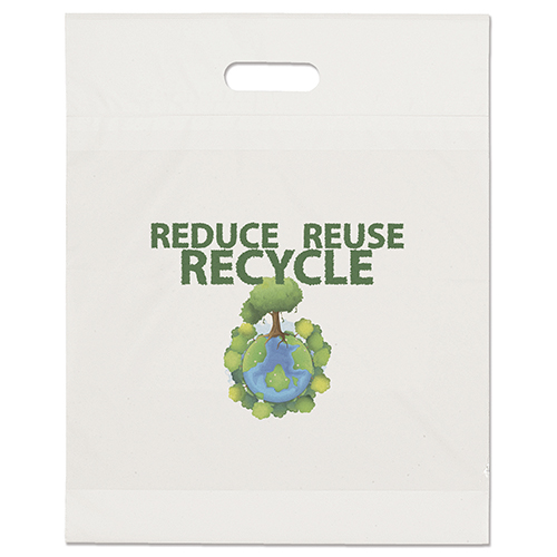This eco-friendly 2.5 mil plastic bag contains up to 40% post-industrial recycled content and up to 20% nonpetroleum-based calcium filler. The bag features fold-over, reinforced die cut handles.