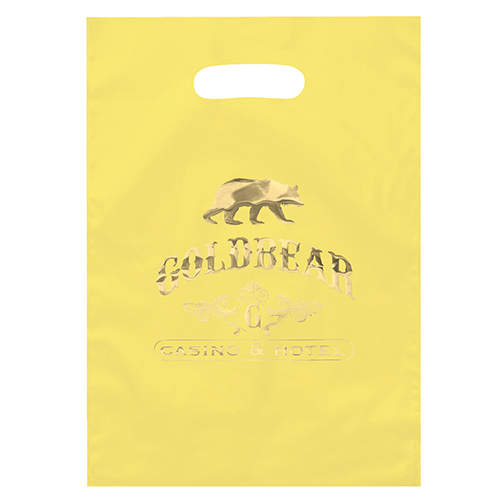 This 2.5 mil lo-density plastic bag features fold-over reinforced die cut handles.