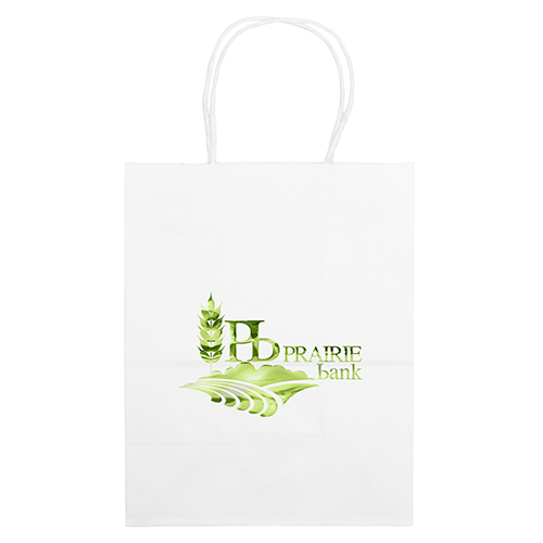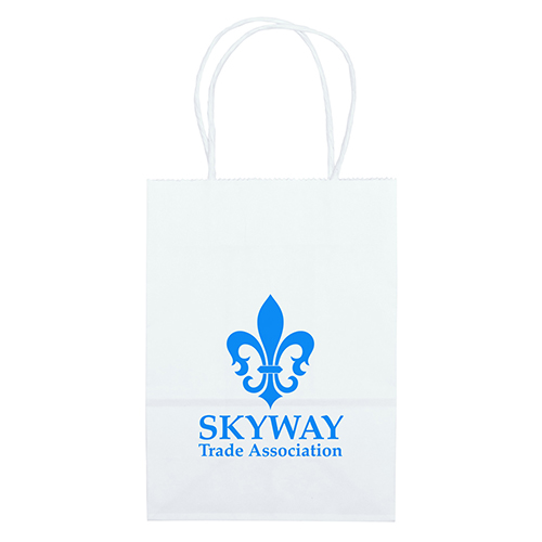 The Mini White Shopper is made with white kraft paper and features twisted paper handles and a serrated cut top.